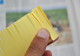 Step 6: Once you reach the point as shown in the picture above, it is time to make the center of the flower. For this take the leftover pieces (3" X 8") of the cardstock paper and make fringes for the center by cutting only 3/4 of the paper(lengthwise) in 3 to 4 mm width and leaving the remaining part to fold.